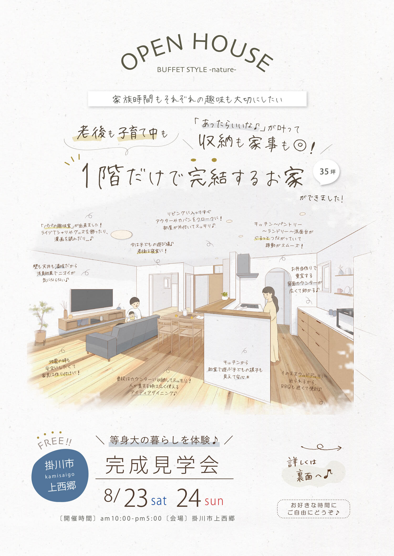 | 時間・場所 | :10:00~17:00【今回はお好きな時間にご自由にお越しいただける見学会です※ご予約不要】・掛川市上西郷 |