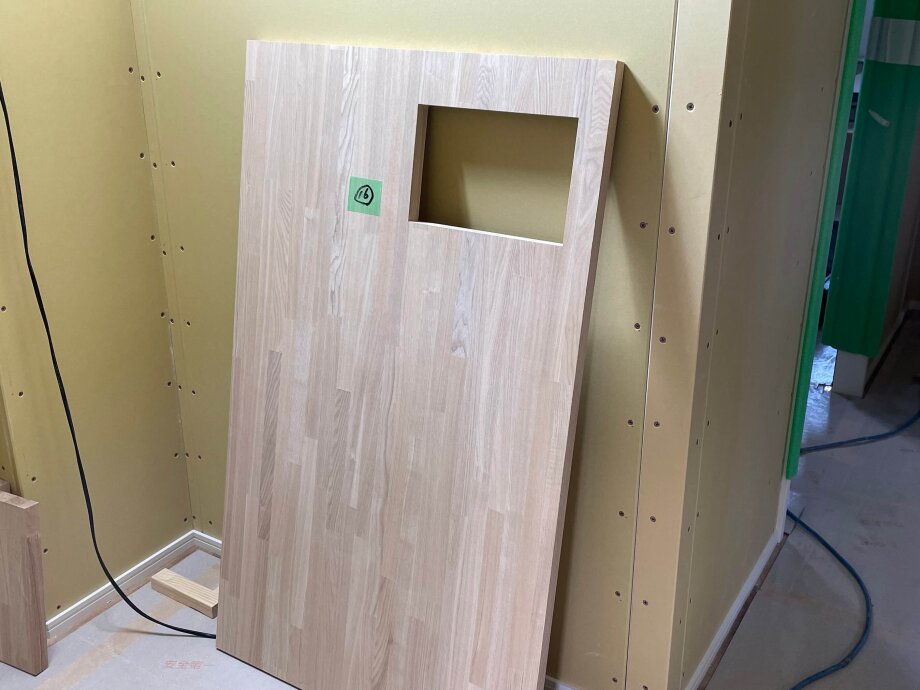 大工さんは洗面コーナーで作業中。
