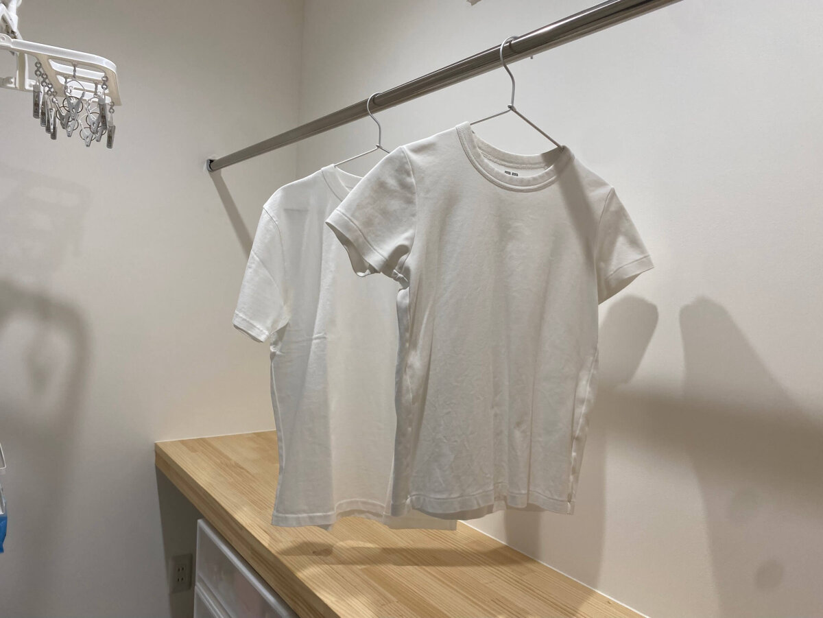 夫のTシャツの袖は横の壁にぎりぎりつかないぐらい、私のTシャツは余裕で干すことができます。