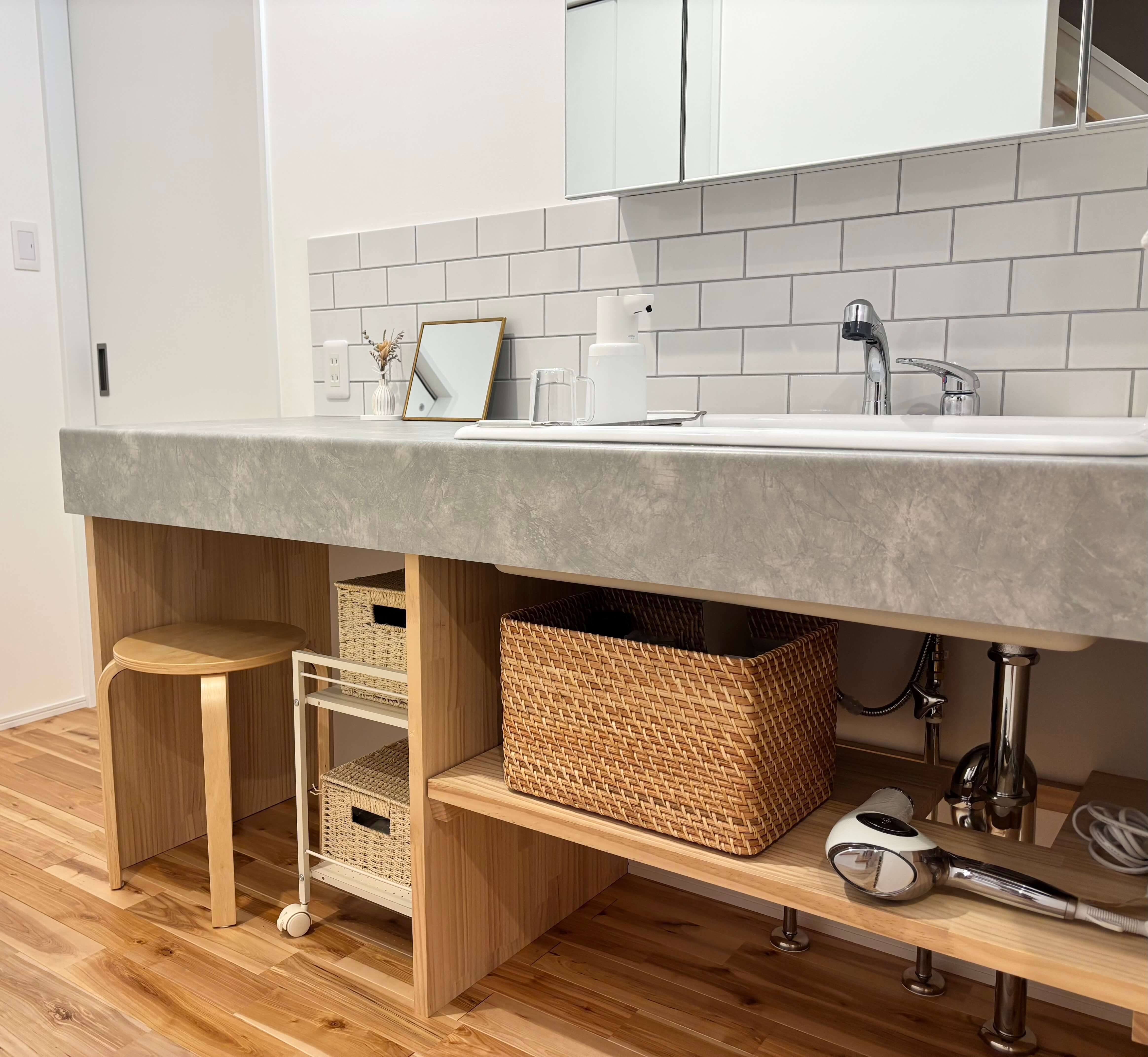 「収納が足りない」というより、造作洗面は収納技術が必要だなあ。と実感しました。我が家の洗面はお家の中心にあるので、来客が来たときなどは目に入ります。