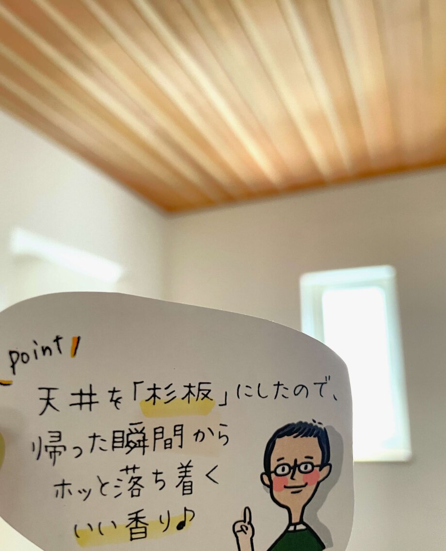 玄関の天井を杉板張りにしたので、ドアを開けると杉の香り。
