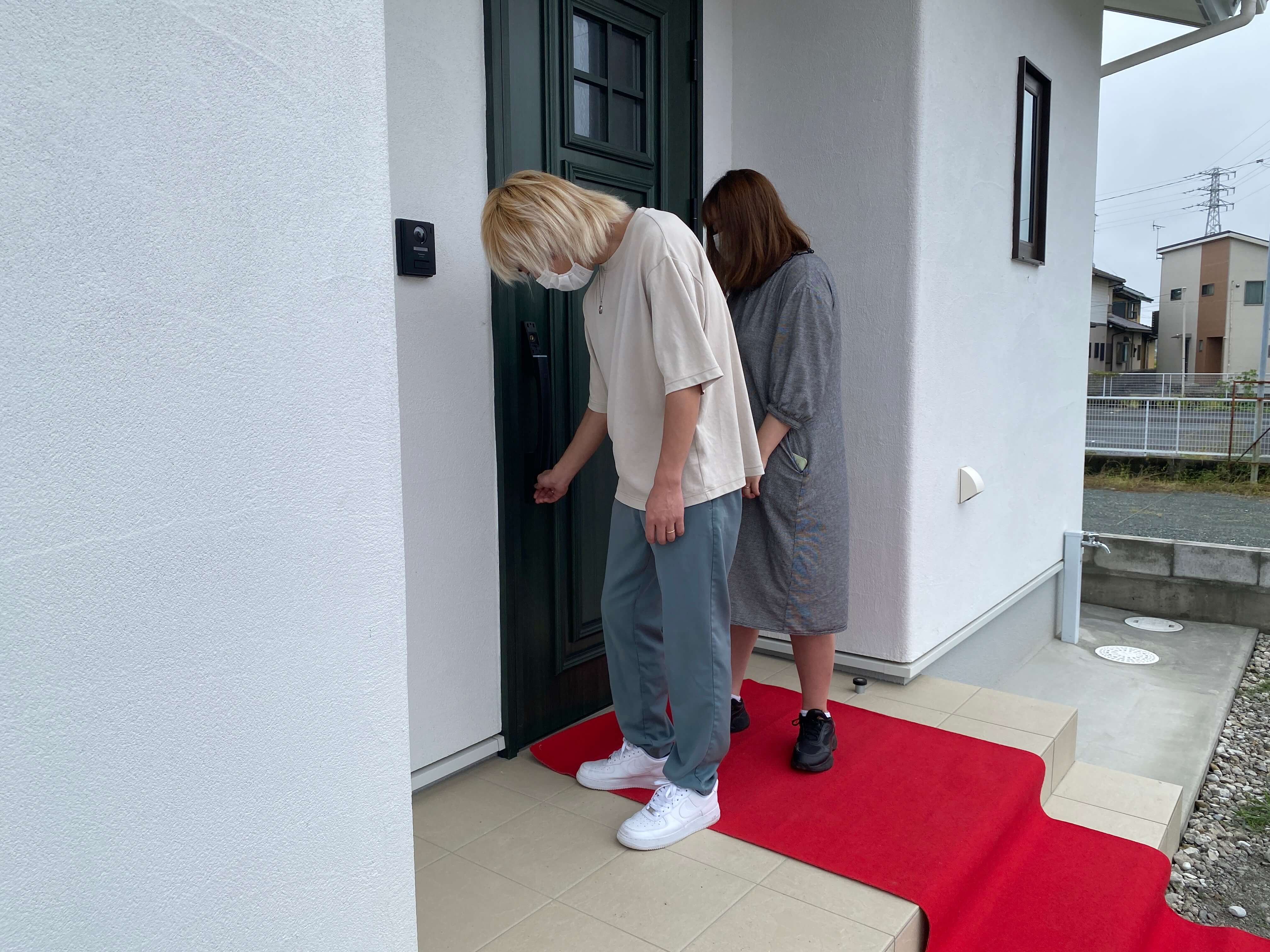 玄関の前でテープカット、そして玄関ドアの鍵を開けてお家の中へ入り、