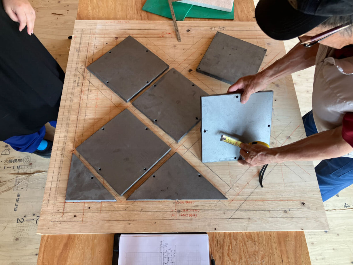 実寸の平瓦を並べながら左官さんが考えて来てくれた瓦割と現場が合うのか?