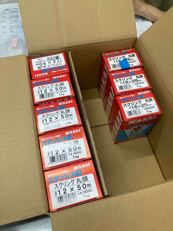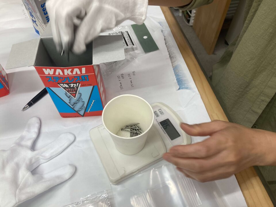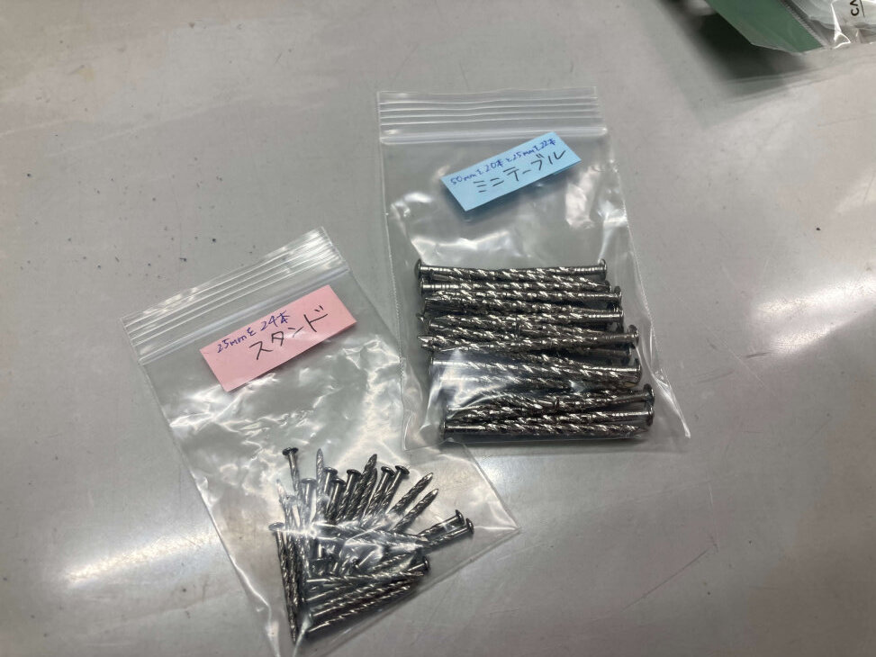 事務所でパートさんが釘の袋詰めをしてくれています!