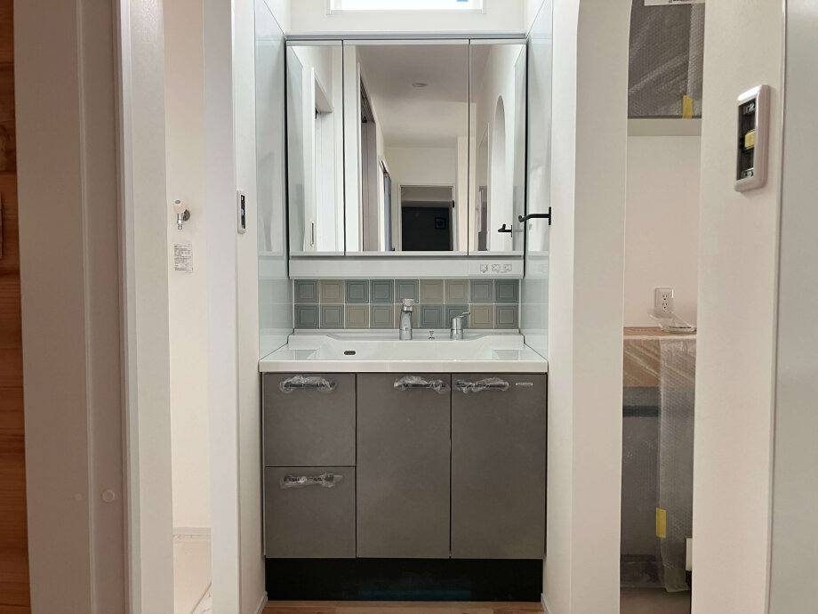 そして洗面台も設置されていてミラーボックスとの間にはタイルが貼られ、お施主様のこだわりが詰まっています^^