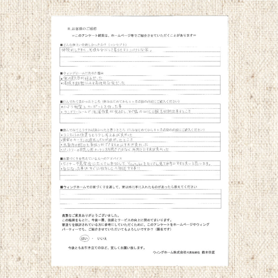 奥様:ウィングホームさんは地元だから何かあった時にすぐ来てくれると聞いていました。実際に建設中も気になることがあったらLINEをして、すぐに返事をしてくれたので、近くで寄り添ってくれている感じがして安心でした。